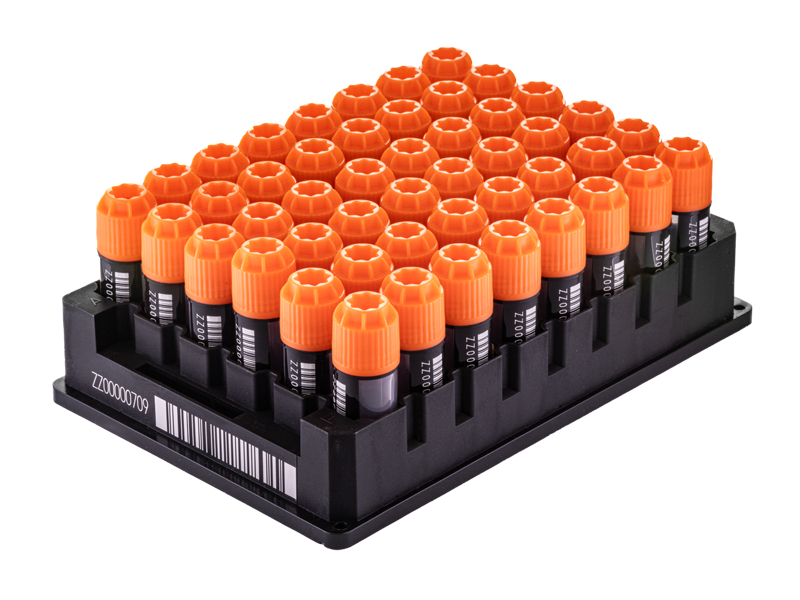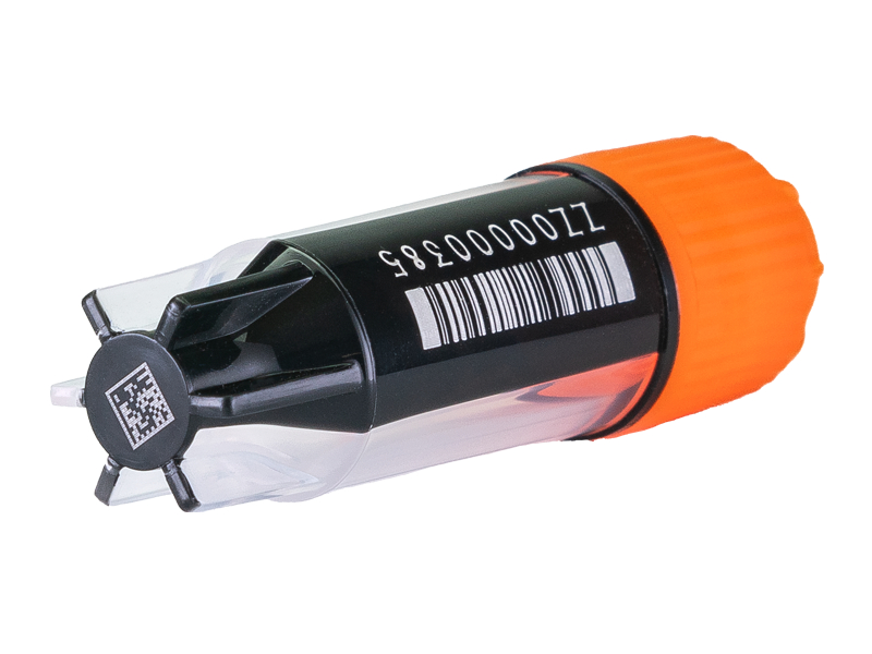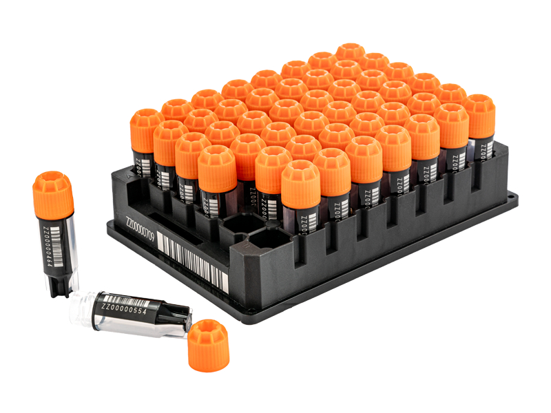 - Permanently laser etched 2D code on base, 1D linear barcode and human readable number on the side, ensuring a permanent link between sample and data