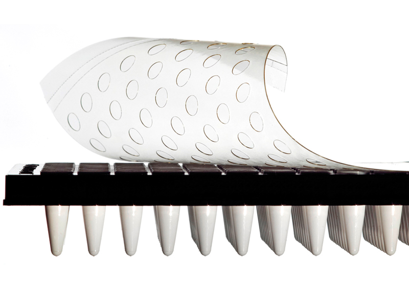 Adhesive sealing polyester film, recommended for qPCR and other optical applications, such as fluorescence or colorimetric measurements, with 96-well plates only.