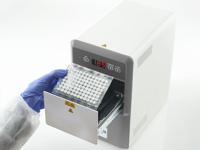Semi-automated sheet heat sealer compatible with a wide range of seals and microplates, PCR and assay plates, as well as storage plates of differing designs and heights.